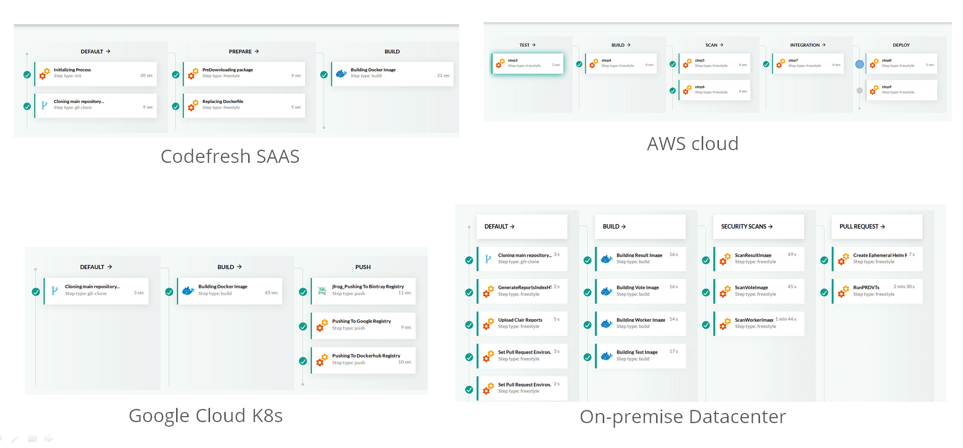 Codefresh will then act as a unified dashboard for all pipelines (regardless of their runtime environment) presenting to users the same experience and traceability across all different clusters.