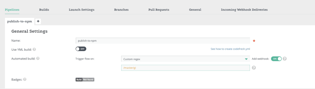 Here you can find my repository promise-fcm that uses Codefresh to automatically publish to NPM. I use a codefresh.yml file to get more flexibility on the steps and flow within my pipeline. Check out the documentation to learn more about codefresh.yml.