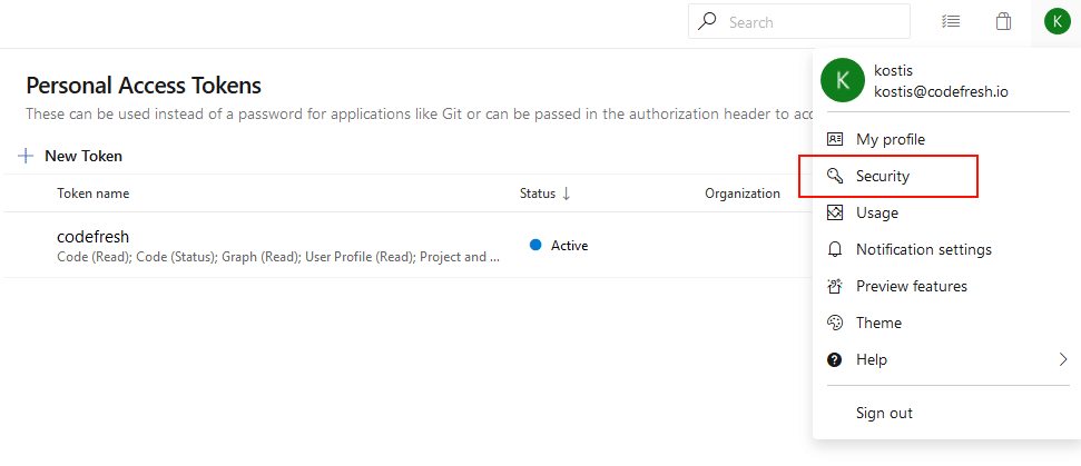 Step 1 – On the Azure side, you need to create a personal access token, which is the same thing that you would do if you wanted to give Git access to a shell script or external application.