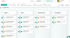 A deployment that starts from a Git commit can be monitored with Codefresh from beginning to end, following all pipeline stages from application compilation/packaging to security scanning and infrastructure deployment.