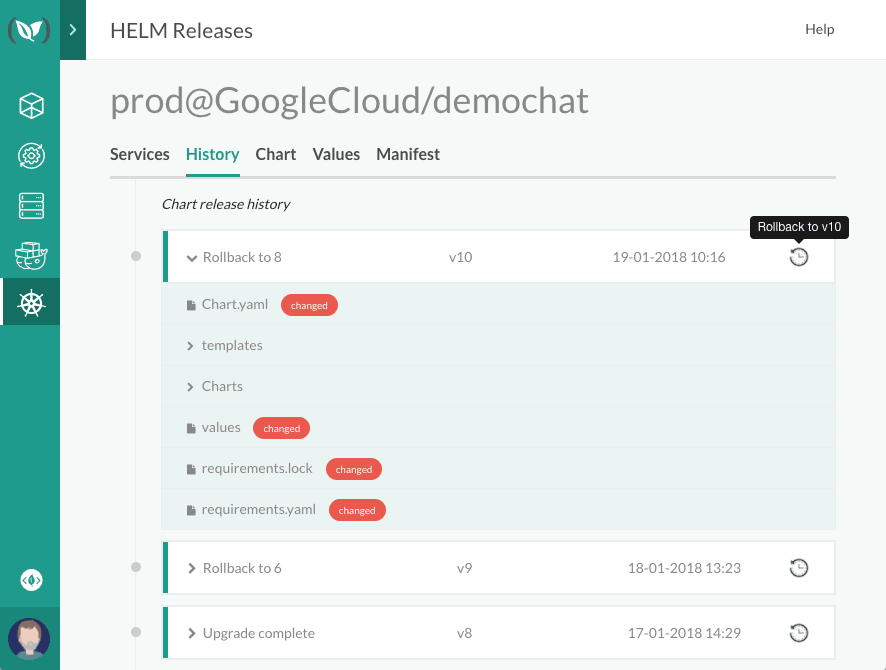 However, the most impressive capability is that you can rollback a version right from the GUI. And in this case, rollback means the Helm rollback (i.e. going to a previous version of the chart).