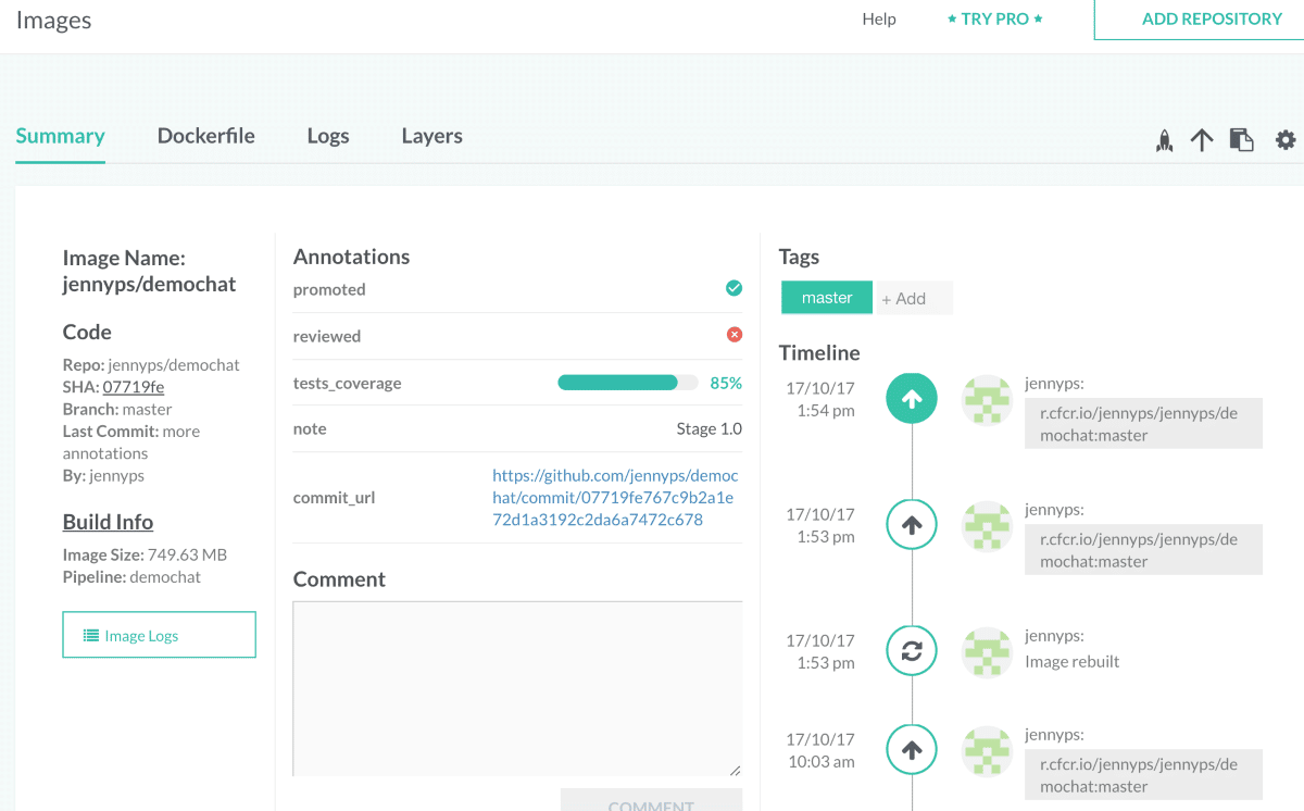 And most importantly of all, you can annotate your Docker images with your own metadata. For example, you can mark images that have passed security scans, or code quality gates, or load testing approval. The metadata can be added either directly from the GUI or via the pipeline syntax.