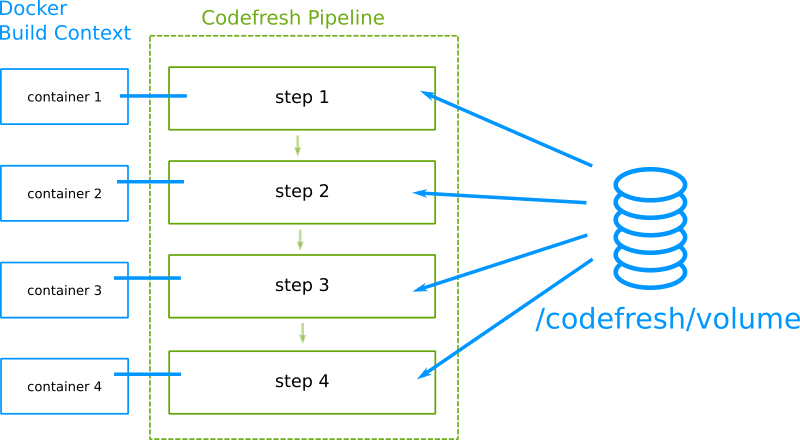 In Codefresh, in order to transfer information from one step to the other, you do (drumroll please)….absolutely nothing. In Codefresh all pipeline phases share a common volume (which includes the code of your project). So everything that is created in the project folder is automatically available to the next phase.