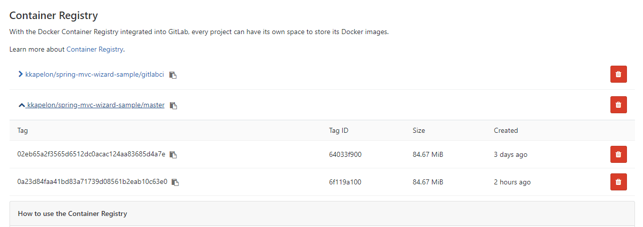 You only see the tag, the size, and the date of the image. There is no other option available (which might make sense as we have already seen that the registry in GitlabCI is tied to a single project).