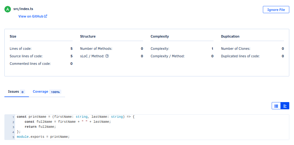 Using a code coverage solution makes it possible for users to access additional information on the quality of their code. The following screenshots showcase the analysis interface of the file that we ran tests on. It is worth highlighting that Codacy analyses the code quality of all files within the git repository by default. Resulting, also files that are not part of the code coverage report are automatically analysed.