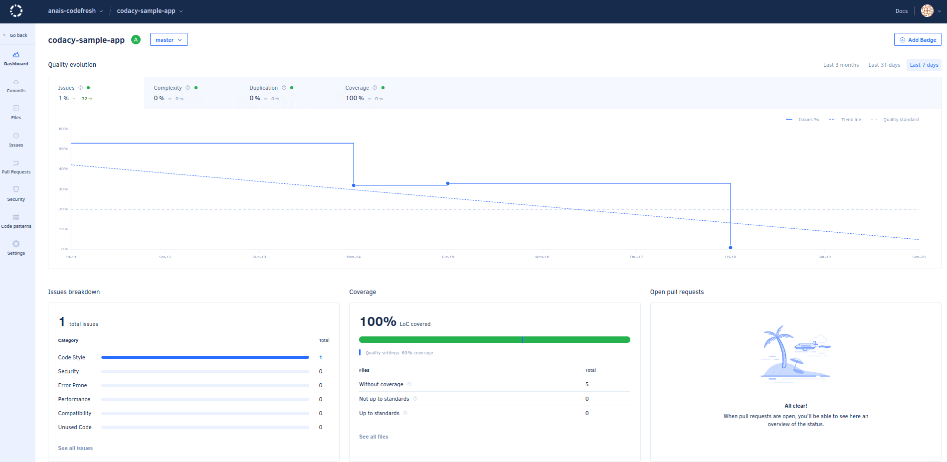 Similar to Codecov, Codacy focuses on enhancing its code analysis by connecting coverage reports with the information recorded on your git repository. This includes issues, pull requests and commits. From the main Dashboard, users can access specific information on the repository, such as file coverage. However, Codacy does not provide you with an option to view coverage reports directly. The pro version allows users to set-up security alerts, which is a feature that is unique to Codacy.