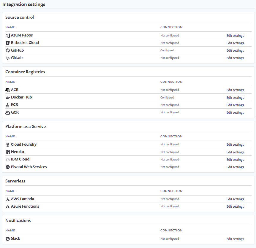 Furthermore, you can set up notifications to receive reports right to your inbox weekly. By utilizing the Snyk integration settings, users can further automate the scan and reporting process on potential vulnerability issues. Below is a list of integrations that are available to the free account: