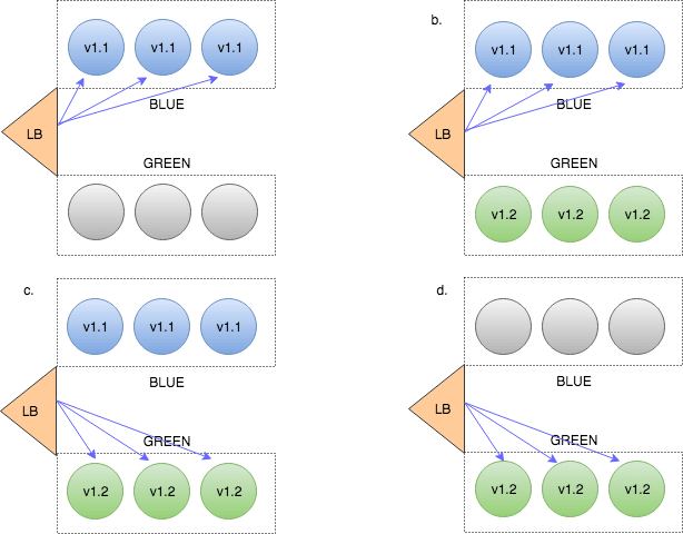 In this approach we always manage 2 versions of our production environment. One of them is considered ‘blue’ – i.e this is the version that is now live. The new versions are always deployed to the ‘green’ replica of the environment. After we run the necessary tests and verifications to make sure the ‘blue’ environment is ready we just flip over the traffic, so ‘green’ becomes ‘blue’ and ‘blue’ becomes ‘green’.