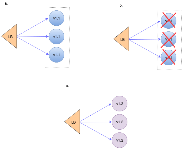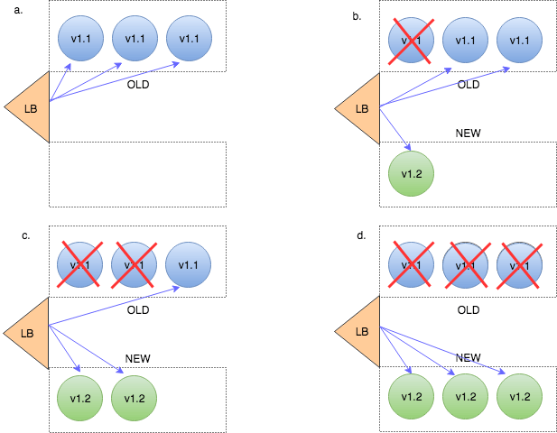 If new instances aren’t found healthy – this strategy provides a smooth rollback procedure: new instances get killed off and old version instances get scaled back to their original capacity.