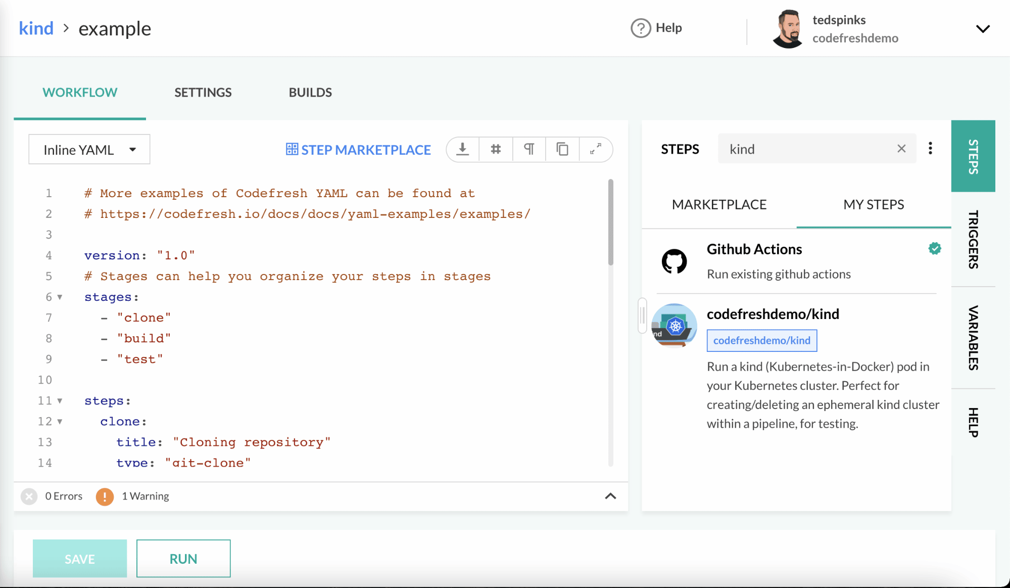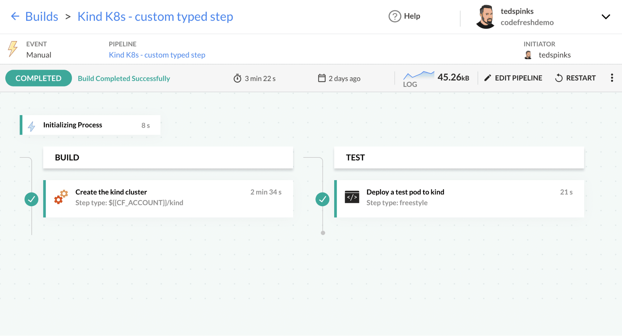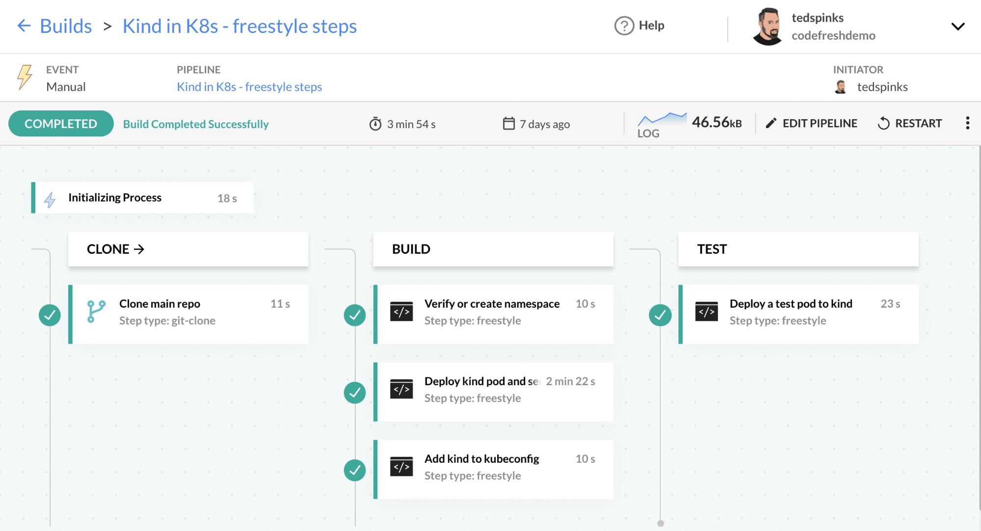 To that end, I’ve placed a copy of the kind pod YAML from Jie Yu and Steven Chung’s blog article, as well as the Codefresh pipeline YAML for these steps, into one GitHub repo. You can check them out here: https://github.com/TedSpinks/kind-codefresh-demo.