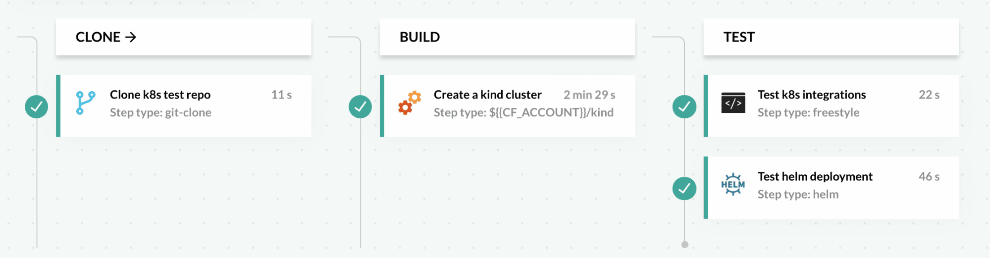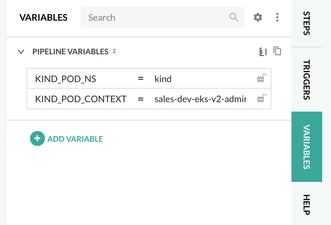 Note that the kind step uses the same two pipeline variables that we discussed previously: KIND_POD_CONTEXT and KIND_POD_NS.