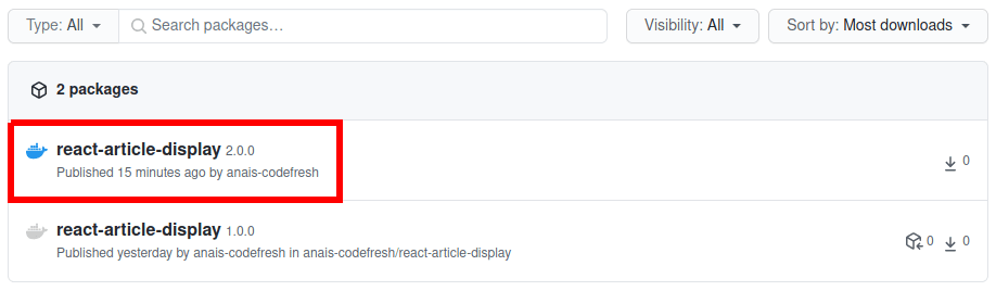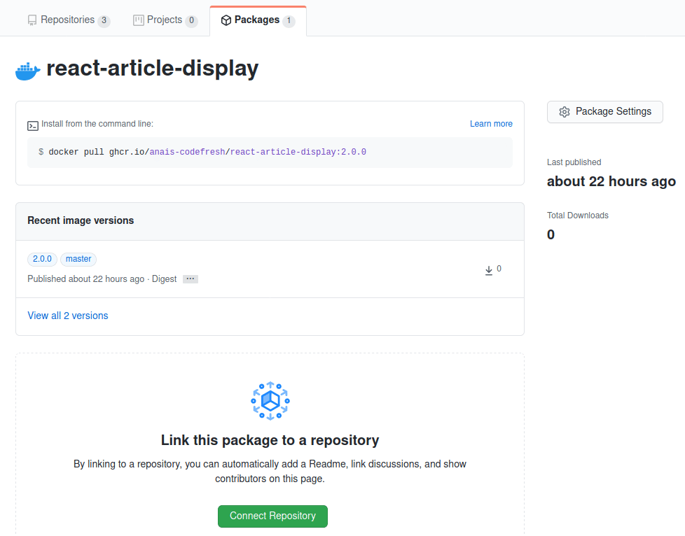 After you run the pipeline, your Docker images will be automatically pushed to the GitHub Container Registry. Once done, they will become visible in the GitHub Packages UI. You can access the image specifications either with the Image Dashboard in your Codefresh account or through the GitHub UI like shown in the following screenshots.