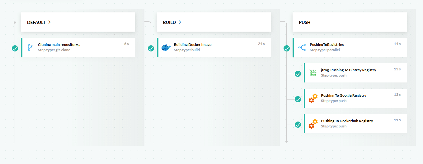 The basic parallel mode is the easiest mode to use in Codefresh pipelines. It allows you to take any existing step in a serial pipeline and “split” into one or more parallel steps. Usually, the parallel steps will be of the same type (but this is not required). Here is an example where a Docker image is pushed in parallel in 3 Docker registries:
