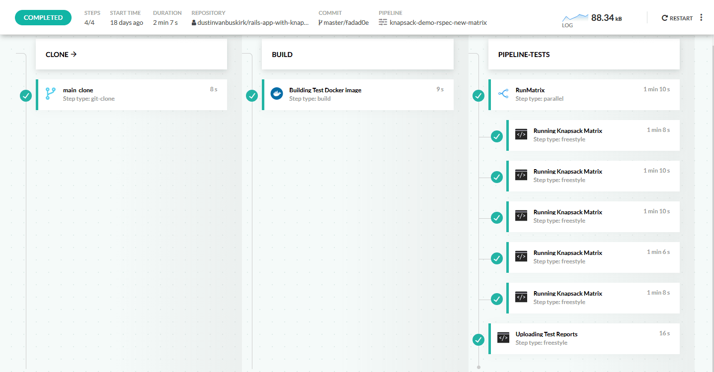 For more details see the integration page of Knapsack. Knapsack Pro tests also work great with service containers for running tests against databases or other external services. Here you can find articles dedicated to Knapsack Pro configuration for Ruby on Rails project on Codefresh and for Cypress end to end test runner.