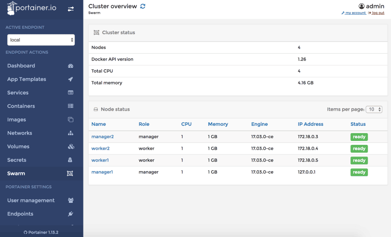 When using Portainer with Docker Swarm or Swarm Mode, the Swarm section provides details for each node in your cluster.