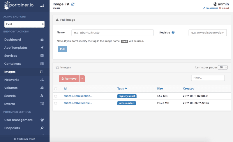 The Images section provides a view of all available images with the feature to pull Docker hub or a private registry.