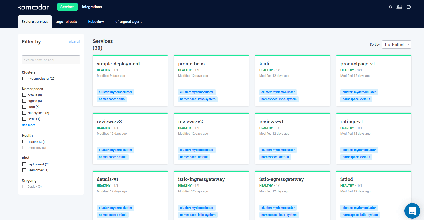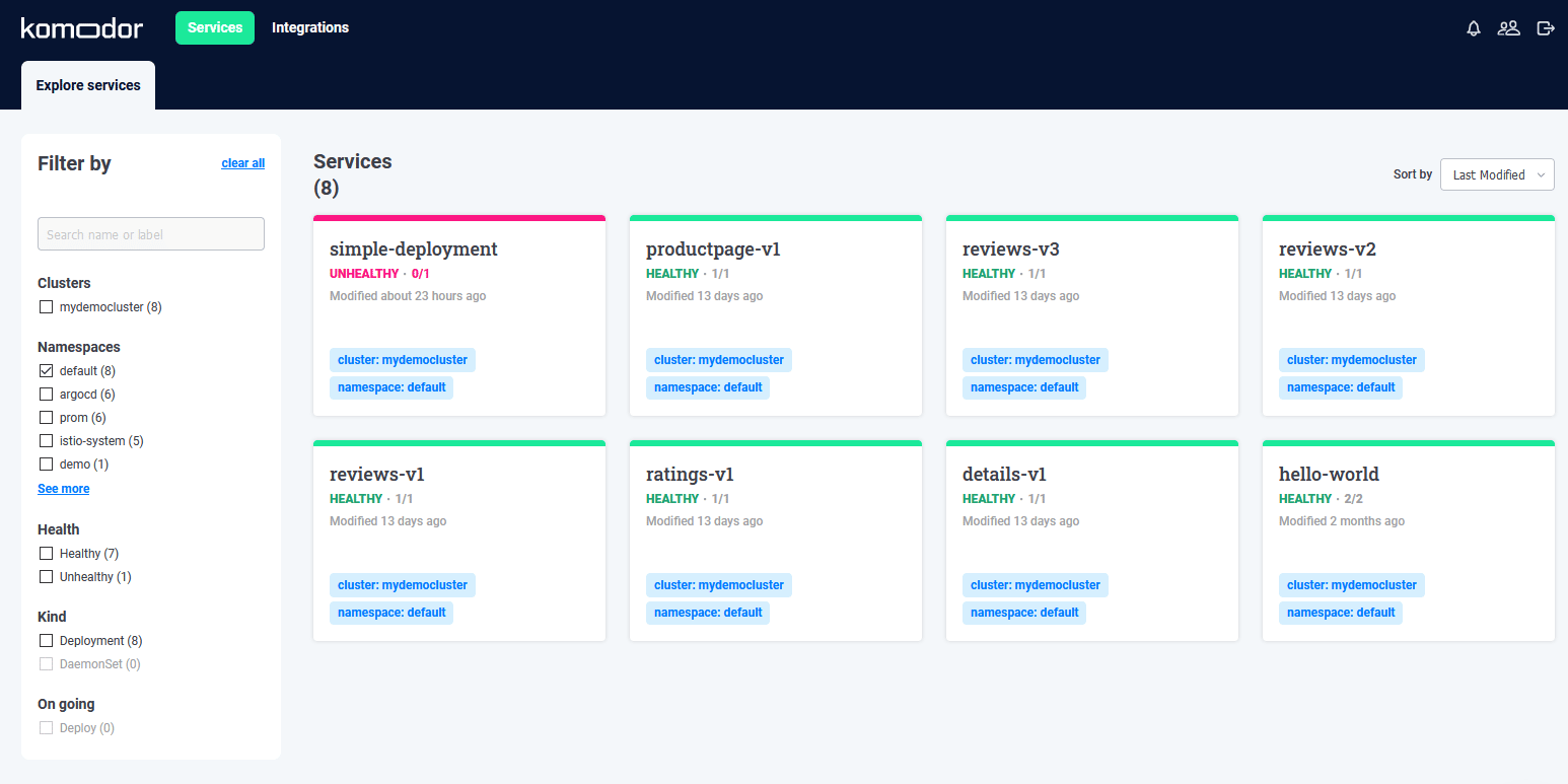Once your agent is installed successfully your dashboard will be automatically populated. From now on Komodor is monitoring several events in your cluster and the web UI is updated in real time.
