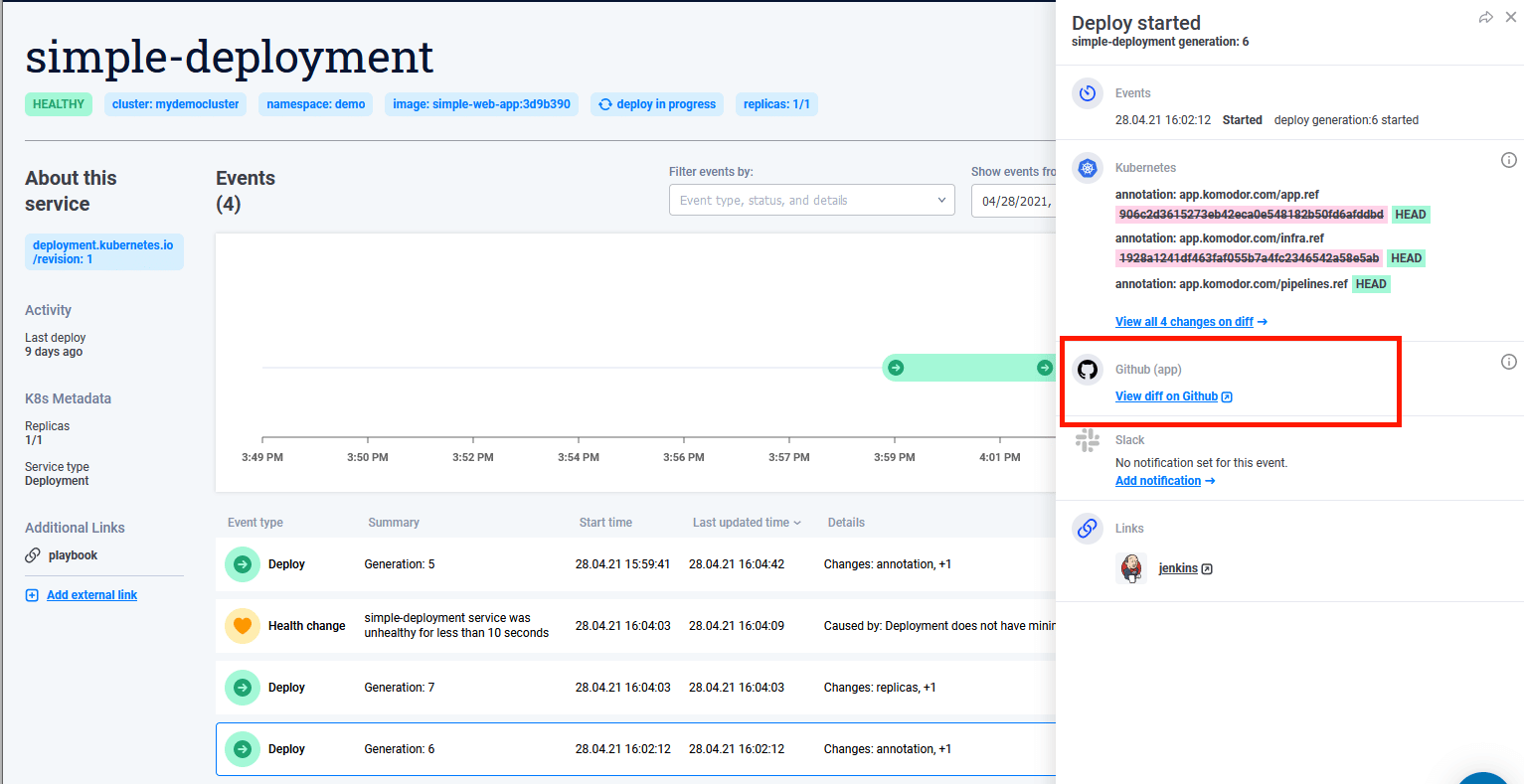Notice that Github information is just one example of annotations that you can add to your service. Komodor supports other types of annotations such as links to your metrics, your alert provider, your CI pipeline, your playbook and so on.