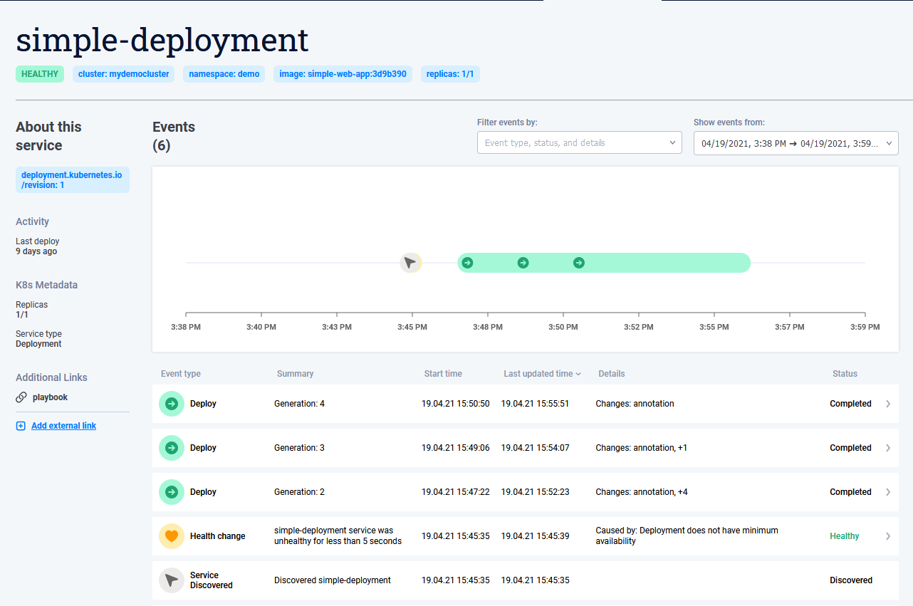 The timeline is one of the major advantages for Komodor because it captures all events that affect your application. Out of the box Komodor monitors your application for restarts, replica changes, manifest changes, health status changes and so on. By adding extra integrations you can also add in the timeline events from external providers (e.g. get alerts from Graphana, New Relic or Datadog).