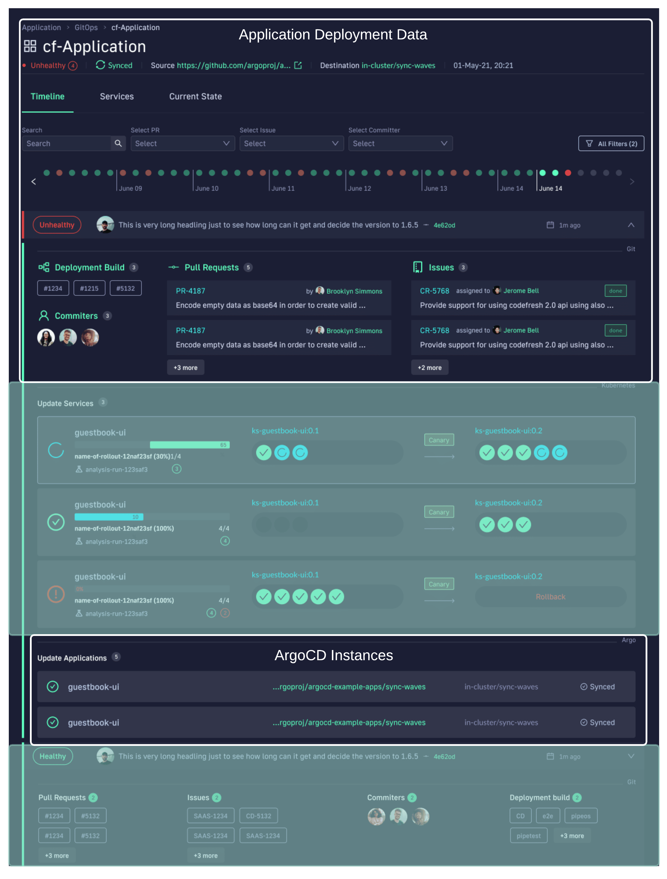 This allows not only your developers to view and better understand your deployments, but it also allows the business to answer important questions within an organization. For example, if you are a product manager, you can view when a new feature is deployed or not and who was it deployed by, but with Argo alone, you don’t have this capability. So, for example, you not only can view multiple Argo CD instances, but you can also view a new feature in QA last week on Thursday and that it’s being promoted and released into another Argo CD instance for Production today. The dashboard is a combination of multiple Argo CD instances and individual features Codefresh offers for your deployments.