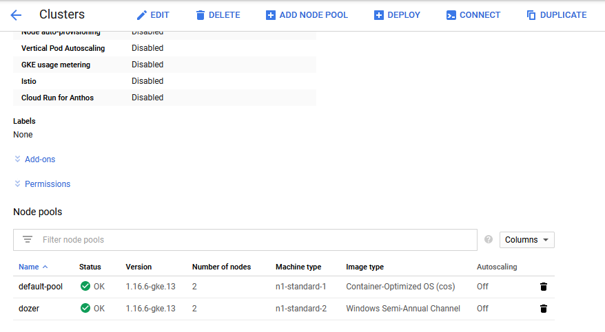 Once that is done you can see the cluster in the Google cloud console (notice the two kinds of node pools)