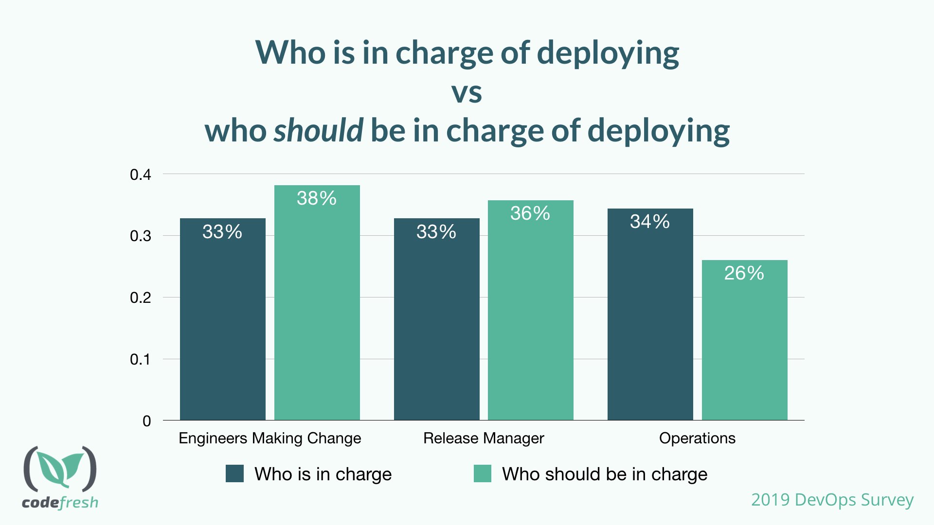 The changes here are not dramatic but there is a clear shift away from operations running deployment with a full 8 point drop. The responsibility of deployment is shifting left to the application engineer.