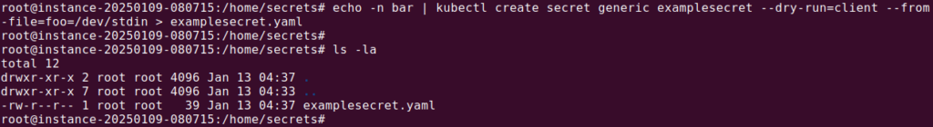 echo -n bar | kubectl create secret generic examplesecret --dry-run=client --from-file=foo=/dev/stdin -o yaml > examplesecret.yaml