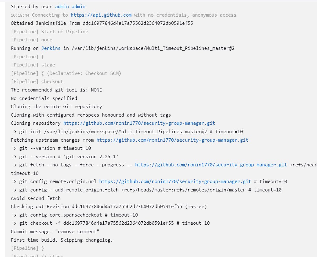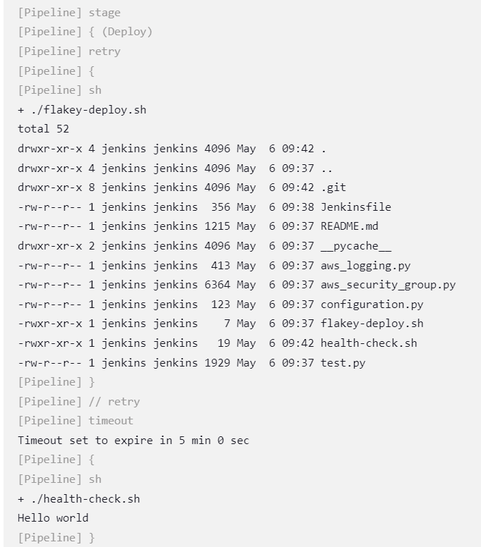 In this example, the flakey-deploy.shscript will be retried five times. If the health-check.shscript fails to execute within five minutes, Jenkins will mark the pipeline’s “Deploy” stage as failed. Retry and timeout steps are often used together.