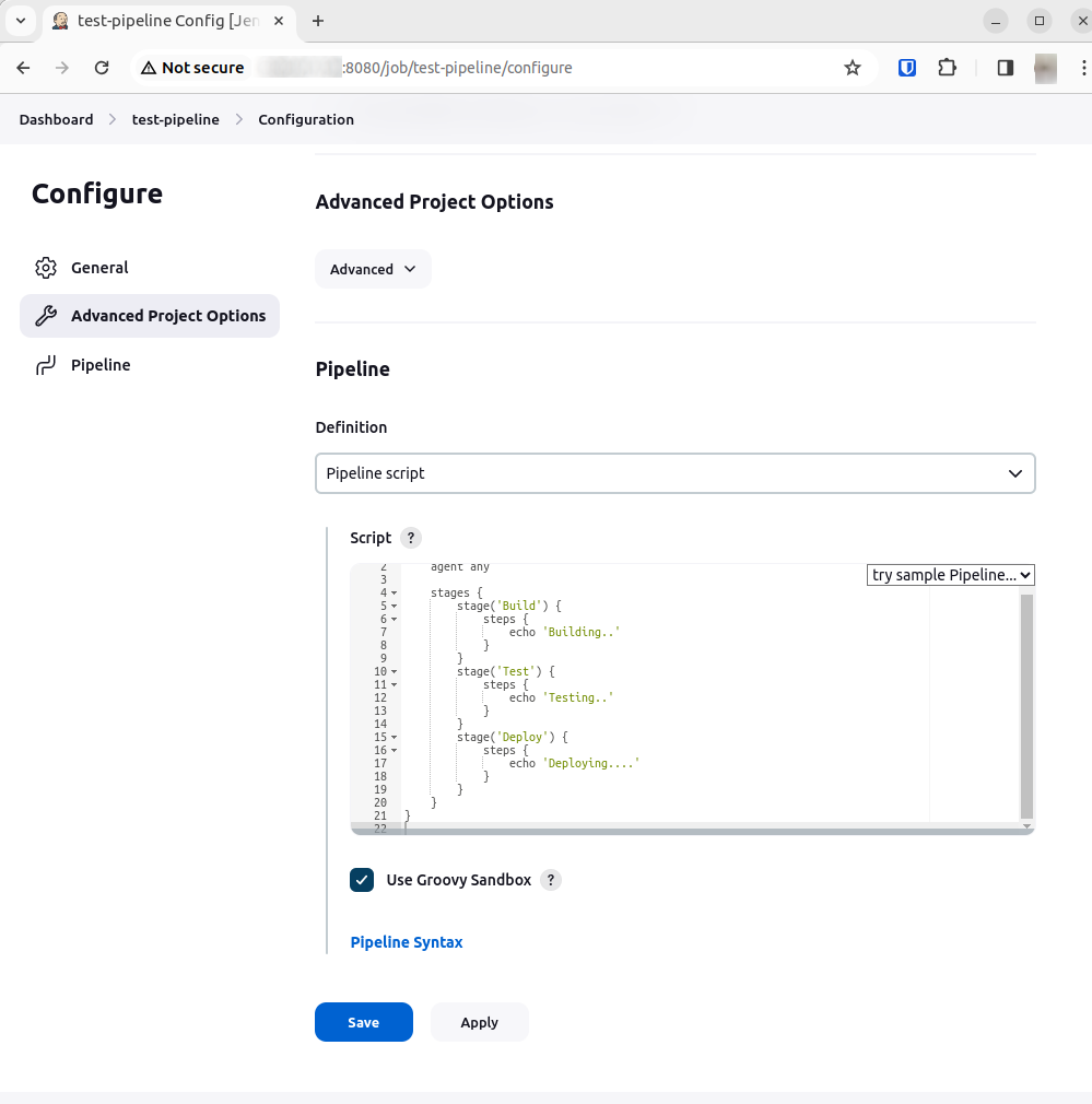 In the configuration screen, select Advanced Project Options. Here, in the Pipeline section, you’ll define your pipeline script. You can either write the script directly in the Script box or load it from a Jenkinsfile in your project repository.